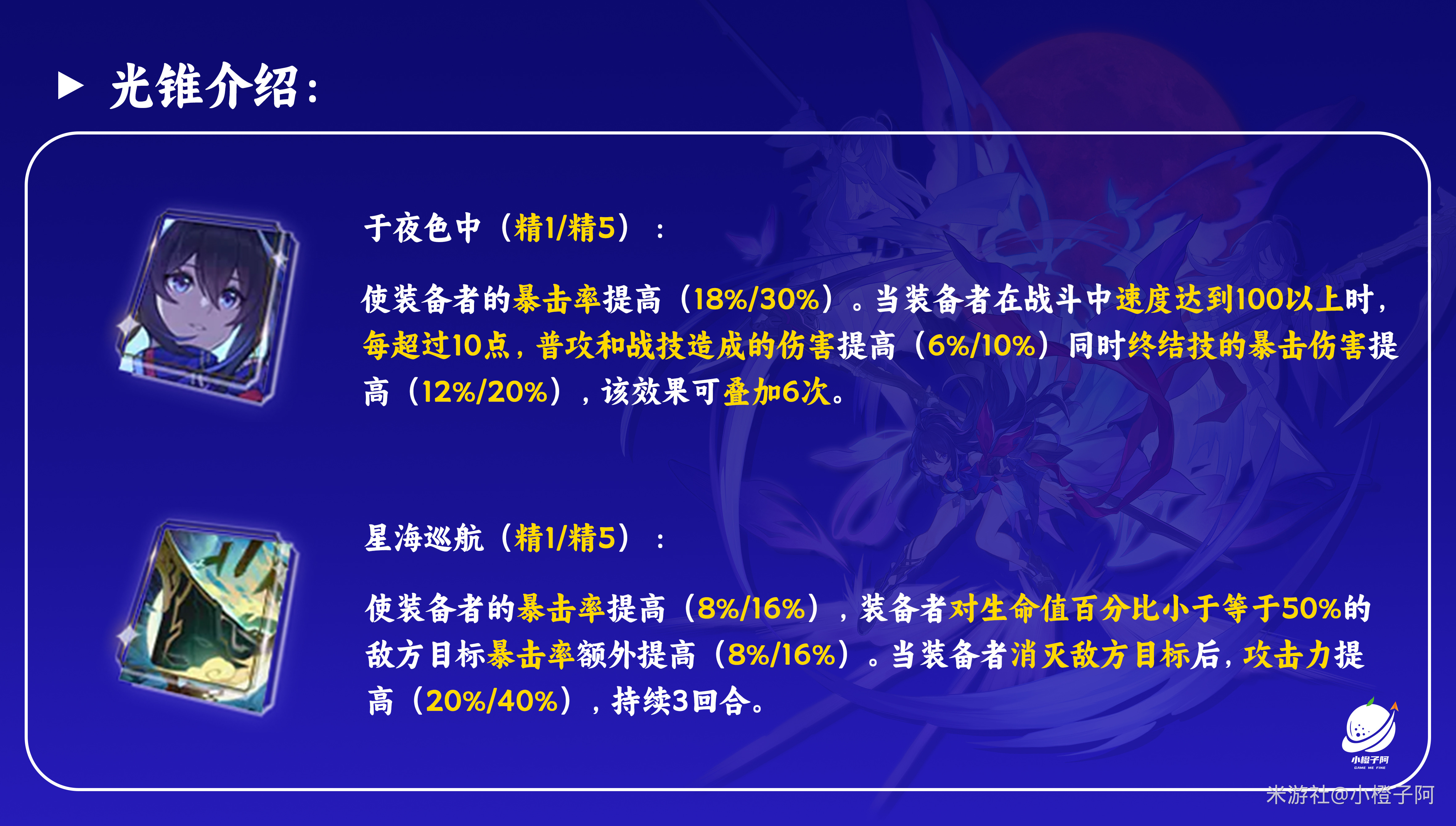 「希儿」的专属光锥,由于「希儿」大招是单段伤害,暴击率对「希儿」那就非常重要了。